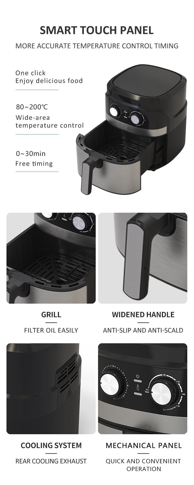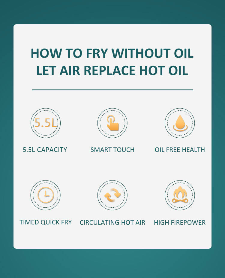 Ang YYZG-550s 5.5L Air Fryer ay isang nababaluktot na kagamitan sa kusina na idinisenyo para sa berde at madaling gamiting pagluluto. Gamit ang pamamahala ng knob ng gumagamit nito, ang pagkaya sa mga setting ng temperatura at timer ay isang simoy, siguraduhin na ang natatanging pamamahala sa sistema ng pagluluto. Ang mekanikal na panel ay hindi na lamang pinapasimple ang operasyon ngunit bukod dito ay isinasama ang sobrang pag -init ng kaligtasan para sa pagdala ng kaligtasan para sa tagal ng paggamit. Ang 0-30 minuto na hindi matatag na katangian ng tiyempo ay nagbibigay-daan sa pagpapasadya ng mga pagkakataon sa pagluluto, na nakatutustos sa maraming mga recipe. Ang kahanga-hangang non-stick na sahig na pagluluto ay nagbibigay-daan sa makinis na paglilinis, habang ang built-in na walong matalinong menu ay nag-stream ng pagluluto ng Revel In. Ang istraktura ng drawer ng Air Fryer ay nagbibigay sa pagiging praktiko nito, na nagbibigay ng maayos na pag-access sa pagkain at pagpapabuti ng ordinaryong kaginhawaan ng gumagamit.